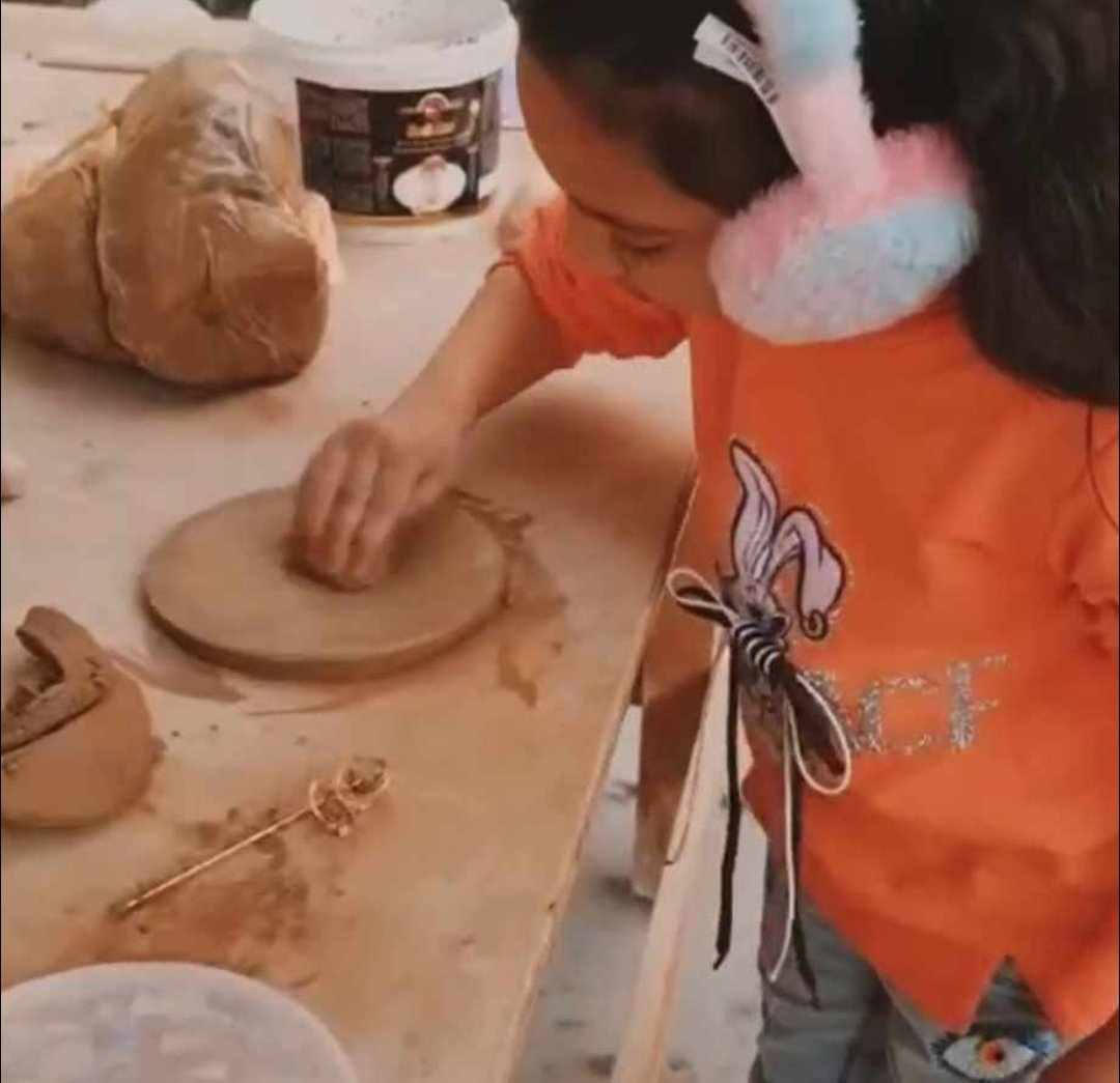 عند اصطحابنا الى موقعها شاهدنا مجموعة من القطع الفخارية أسطوانية الشكل قسم منها لم يكتمل بعد وفي الجزء المقابل مجسمات تجسد اشكال النخيل واعمال خزفية اخرى كجرار الماء فيما تتناثر قطع متنوعة الأشكال والأحجام على طاولة تتوسط المكان