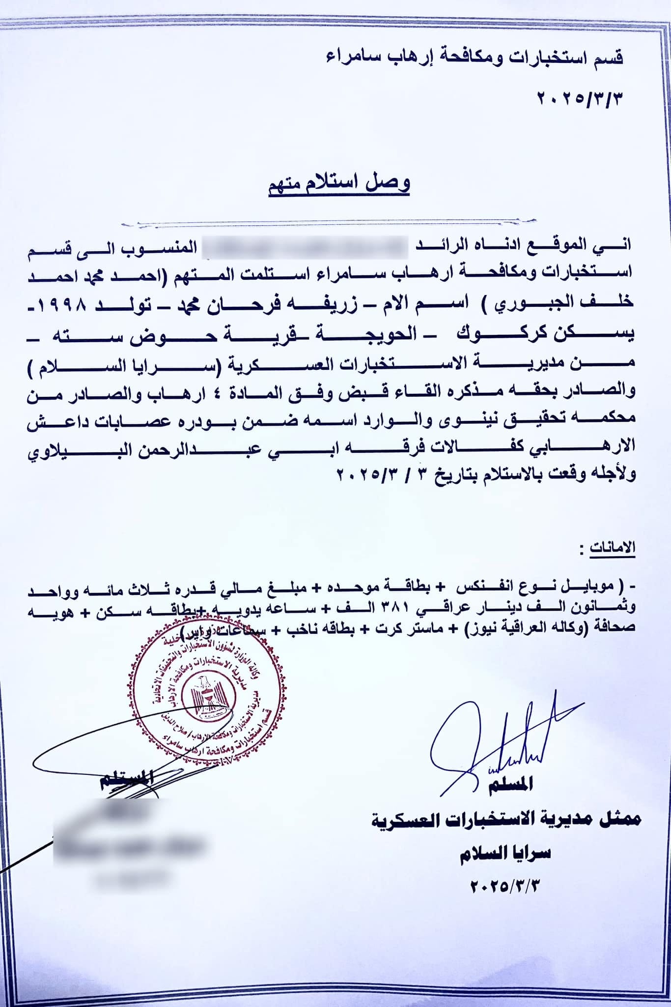 وقد تم تسليم المعتقل أصولياً إلى قسم استخبارات ومكافحة الإرهاب في سامراء لاستكمال الإجراءات القانونية اللازمة بحقه.