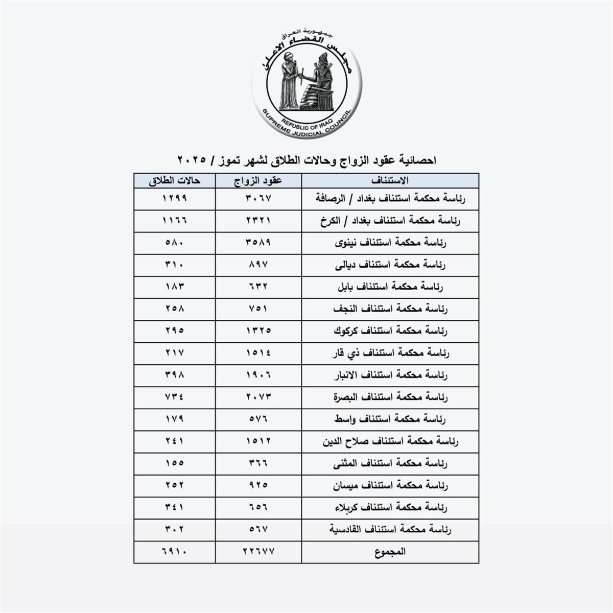 كشف مجلس القضاء الأعلى في العراق عن تسجيل 22,717 عقد زواج مقابل 6,910 حالة طلاق في محاكم العراق (باستثناء إقليم كوردستان) خلال شهر تموز/يوليو 2025 في مؤشر يعكس استمرار الفجوة بين نسب الزواج والطلاق. وتصدرت محاكم بغداد/الرصافة القائمة بـ3,067 زواجًا و1,299 طلاقًا تلتها بغداد/الكرخ ونينوى والبصرة وغيرها من المحافظات في حين سجلت محافظة النجف 751 عقد زواج و258 حالة طلاق