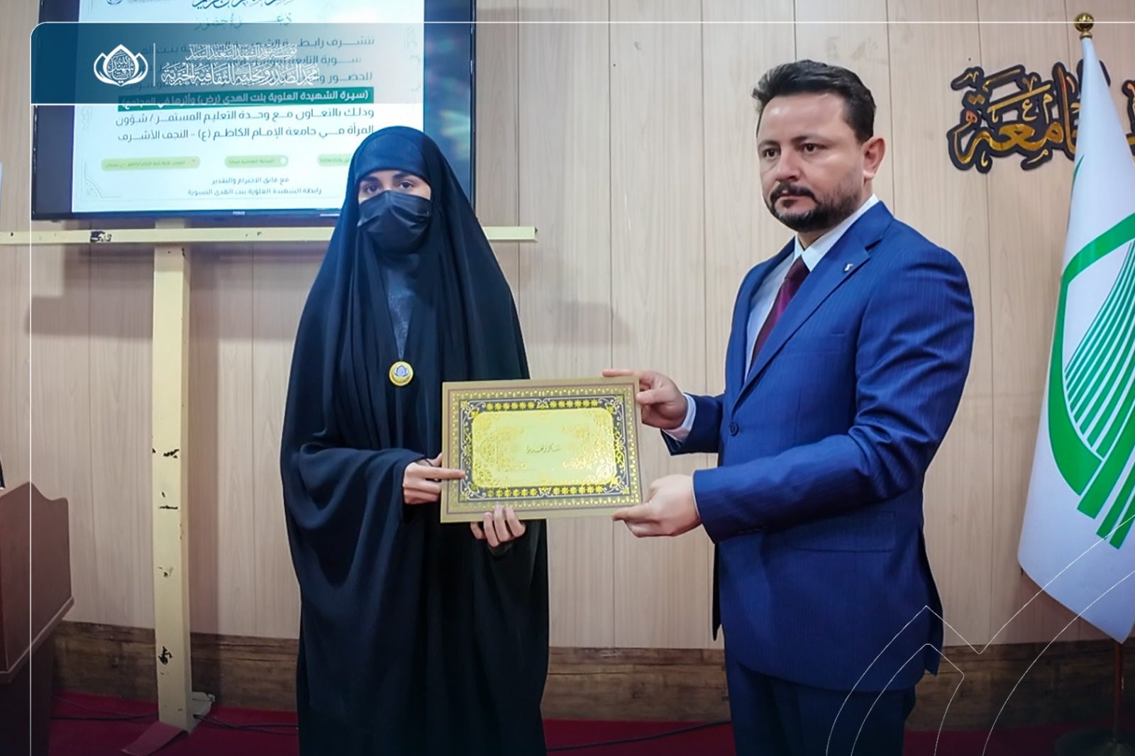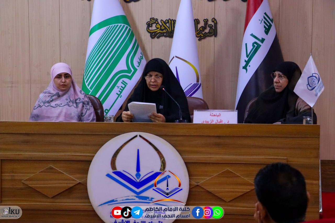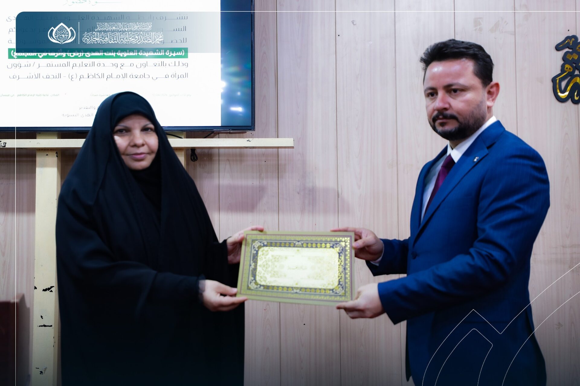 وشهدت الندوة تقديم بحث موسوم بسيرة حياة الشهيدة العلوية بنت الهدى (رضوان الله عليها) وتأثيرها على المجتمع من قبل الدكتورة إقبال كاظم شمران الزبيدي مديرة شعبة شؤون المرأة وحقوق الإنسان في دائرة صحة النجف الاشرف واستعراض أبرز محطات سيرة بنت الهدى وما قدّمته من قيمٍ معاصرة للمرأة المسلمة حيث جرى التأكيد على أن تجربتها جسّدت معاني العفاف والمسؤولية الاجتماعية وبناء المجتمع لتبقى شاهدًا على أن الكلمة الواعية موقف وأن التربية والكتابة والعمل الاجتماعي أدواتٌ لصناعة التغيير وصيانة الهوية الأخلاقية في مواجهة التحديات